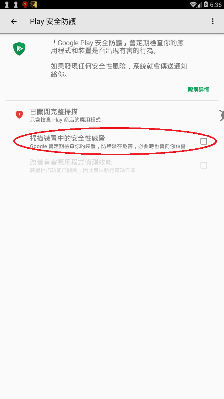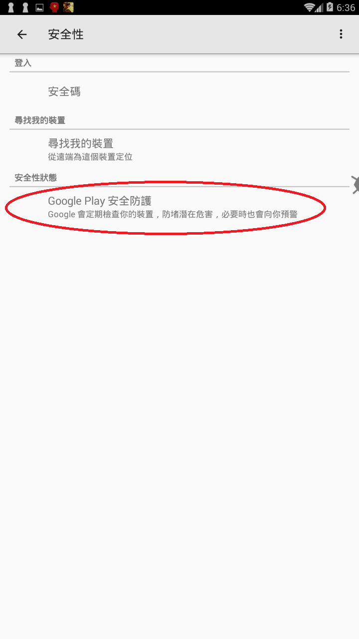 打開Google設定,按如圖順序進入。關閉‘Google Play安全防護’即可。一、