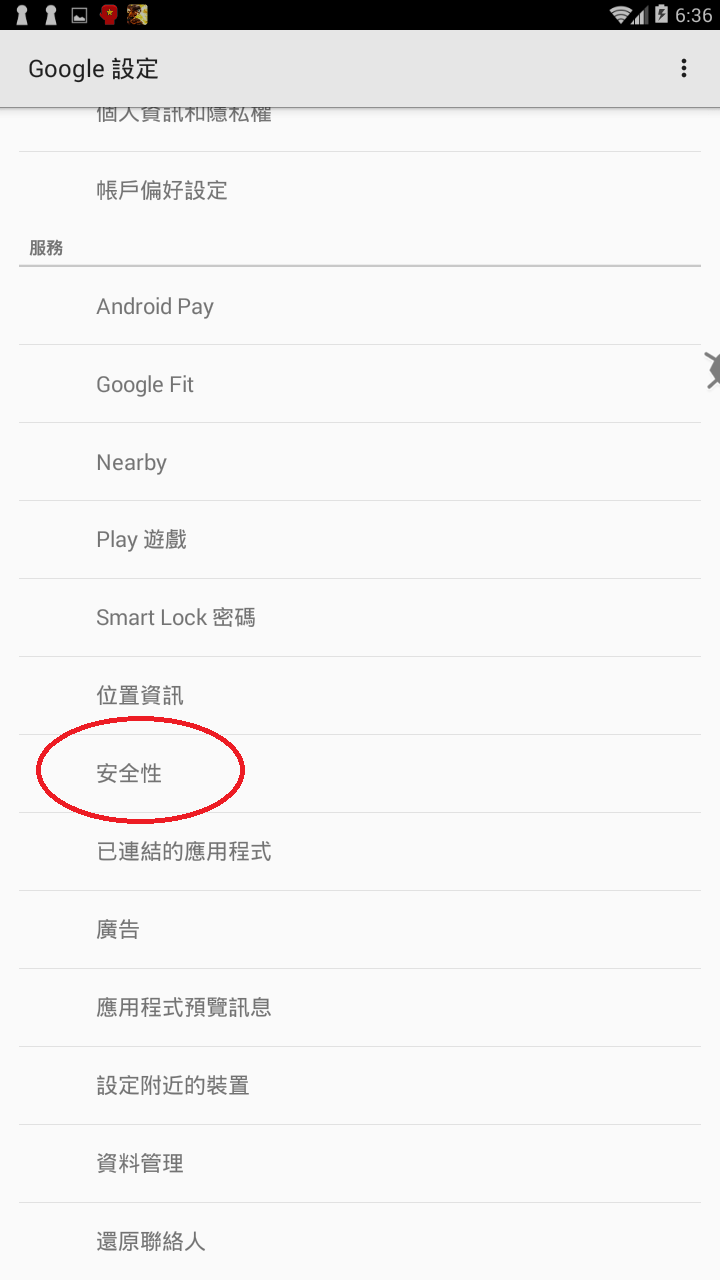 打開Google設定,按如圖順序進入。關閉‘Google Play安全防護’即可。一、